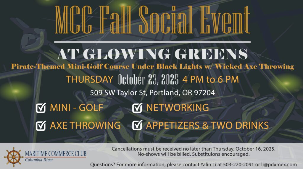 The Maritime Commerce Club members and friends enjoyed an action packed Fall Social at Glowing Greens! Attendees enjoyed an afternoon filled with friendly competition over mini-golf and axe throwing, complete with drinks and appetizers, and the opportunity to connect and socialize. MCC was especially excited to welcomed new members who took advantage of the membership drive offer to attend the Fall Social for free. We look forward to seeing everyone at the next MCC event!